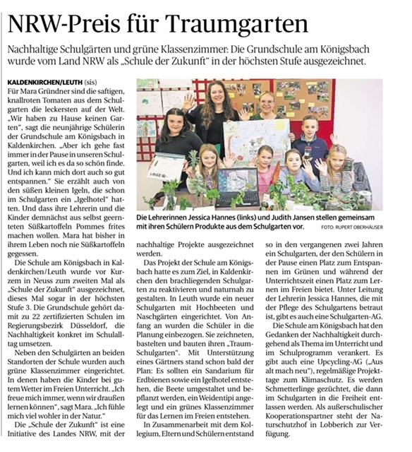 Die Schule am Königsbach in Kaldenkirchen/ Leuth wurde in Neuss nun zum zweiten Mal als „Schule der Zukunft“ ausgezeichnet. Die Grundschule gehört damit zu 22 zertifizierten Schulen im Regierungsbezirk Düsseldorf, die Nachhaltigkeit konkret im Schulalltag umsetzen. „Schule der Zukunft“ ist eine Initiative des Landes NRW, mit der nachhaltige Projekte ausgezeichnet werden.